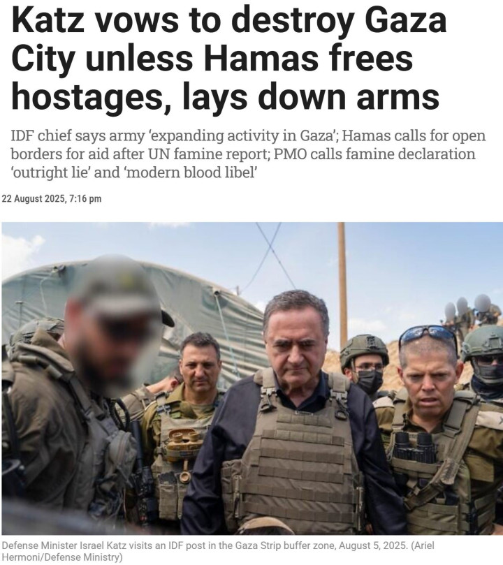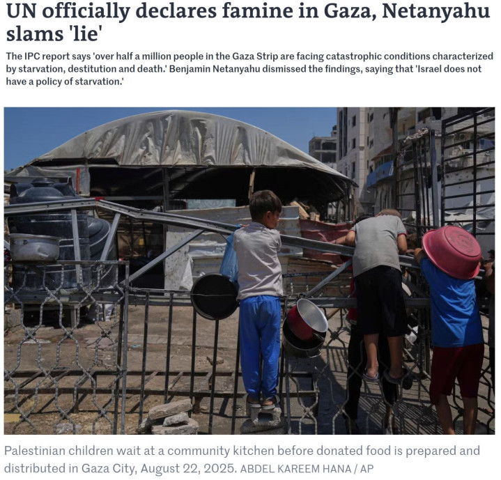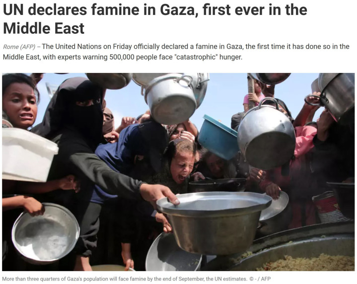 尽管联合国呼吁以色列当局必须立即采取措施,结束加沙地带饥荒,并防止加沙地带出现更多生命损失,但以色列总理内塔尼亚胡22日发表声明宣称,联合国的相关报告是“彻底的谎言”,以色列方面没有采取导致饥荒的政策。